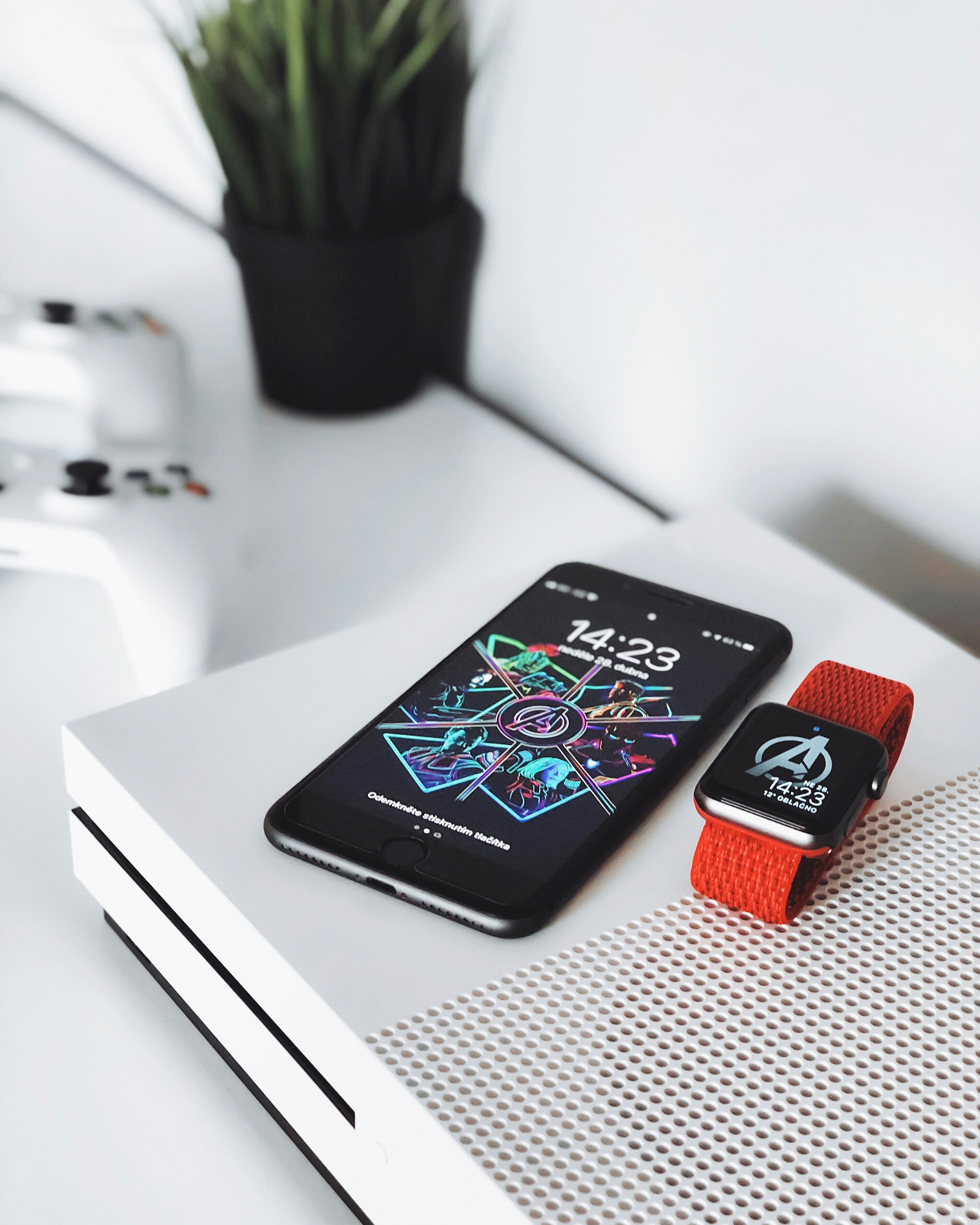 Silver Apple Watch White Sports Band Near Rose Gold Iphone 6